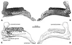 The holotype, or original specimen, consists of only a maxilla (upper jaw bone), and a dentary (lower jaw bone), both from the left side of the same individual. However, most of the other bones of the skull and skeleton have also been preserved in the bonebed, albeit of many different individuals. This other material was described more recently, making Amurosaurus the most abundant and completely known Russian dinosaur.[4]