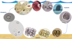 Two to six days after feeding, the trophont detaches from the host and encysts on inert substrates (pond/tank bottom or seabed) transforming into the tomont: the reproductive stage. In this phase, the protozoan is round and encapsulated in a cellulose wall, which becomes thicker and confers upon it an exceptional resistance to unfavourable conditions and to several therapeutic treatments. The protozoan reproduces asexually, the first division is longitudinal while the succeeding ones are approximately regular and at right angles to each other. Potentially, in two to four days, from a single tomont, 256 new dinospores can be generated. The number of newly formed dinospores is directly correlated to the nutritive state of the trophont.[4]