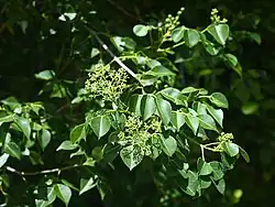Sea torchwood attains a maximum average height of 4 to 12 metres (13 to 39 ft),[4] but ranges up to 50 ft (15 m) in ideal conditions.[6] The smooth, gray bark matures into a rough and furrowed surface with plates. The wood is close-grained.[7] The species has a vertical branching habit. It has a weak taproot, but the lateral roots are stiff and strong. The yellow-gray twigs turn gray with age. The hanging foliage is fragrant. The compound leaves are opposite or sub-opposite. A 3 cm (1.2 in) petiole supports three to five oval or lance-shaped leaflets.[5]