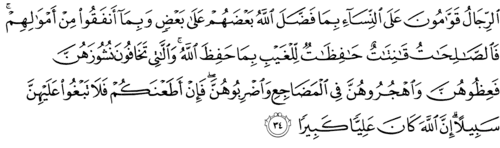 ar-rijālu qawwamūna ʿala -n-nisāʾi bimā faḍḍala - llāhu baʿḏahum ʿala baʿḍin wa bimā ʾanfaqū min ʾamwālihim fa-ṣ-ṣāliḥātu qānitātun ḥāfiẓātun l-il-ghaybi bimā ḥafiẓa -llāhu wa-l-lātī takhāfūna nushūzahunna fa-ʿiẓūhunna w-ahjurūhunna fi-l-maḍājiʿ w-aḍribūhunna fa ʾin ʾaṭaʿnakum falā tabghū ʿalayhinna sabīlan ʾinna -llāha kāna ʿalīyyan kabīran