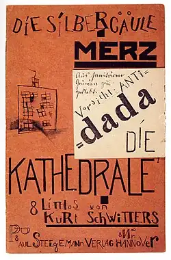 In 1920 Schwitters published a second book in the same format, called Die Kathedrale (The cathedral). Again published by Paul Steegemann, Hannover, the work contained 8 lithographs, and was published in an edition of c. 3000.[7] The lithographs are in the style of Schwitters' drawings of the period, using found elements, collage and stamps, along with scratchy pen and ink drawings.
