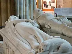 The male figure wears armour, and bears a lion rampant (the arms of the FitzAlan family) on his coat armour, and a lion's head couped as a crest on the helm beneath his head.[5] The female figure wears a veil, wimple, a long gown and a mantle, all characteristic dress of the 14th century; while beneath her gown, her legs are crossed. In a feature common to many English tombs of this period, the knight has a lion at his feet, while the lady has a dog: the lion may indicate valour and nobility, the dog loyalty. He has his right hand ungloved, and her right hand rests on his.