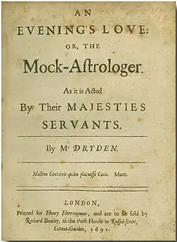 An Evening's Love, or The Mock Astrologer is a comedy in prose by John Dryden. It was first performed before Charles II and Queen Catherine by the King's Company at the Theatre Royal on Bridges Street, London, on Friday, 12 June 1668. Samuel Pepys saw the play on 20 June of that year, but did not like it; in his Diary he called it "very smutty."[1]