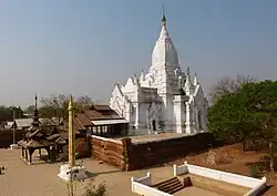 The grateful king appointed him an officer in his army. There, Htwe served with distinction. He started out leading small expeditions to put down minor rebellions, and later became a commander leading major expeditions to more remote regions.[1][note 2] Chronicles say that he proved to be a successful commander, and usually brought home the rebel leader.[1][2] Legends grew about his bravery: He supposedly wrestled and killed a tiger, and an elephant on separate occasions.[1][3] For his battlefield successes, the king rewarded him by granting a senior court title, Ananda Thuriya (Pali: Ananta Suriya),[note 3] and his teenage daughter Saw Min Hla in marriage.[note 4] The minister-general built the Laymyethna Temple in Pagan, inscribing a curse on all those who should injure his dedication.[2]