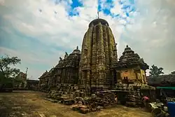 In form, the temple resembles the Lingaraj temple, but includes Vaishnavite (Vishnu related) sculptures.[4] The temple has longitudinal bands of miniature shikharas (shrines), exactly like those in Lingaraj temple, with the minor difference that the number of the shikharas forming one longitudinal band in its case is only three.[5] The sculpture in the exterior walls varies in character in each temple in Bhubaneswar. Most of the female sculptures in the temple walls are overly ornamented and lack originality[6]