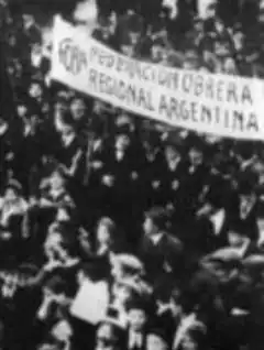 In 1901, Argentina's first national labor confederation, the Argentine Workers' Federation (FOA), was founded. Although its founding principles were influenced by Paraire and Gori, it was at first a joint project with the socialists. In 1902, the first general strike in Argentine history took place. It led to the passing of the Residence Law, which gave the government the power to deport "subversive foreigners". This law was used to expel hundreds of anarchists,[8] while a great number of them fled to Montevideo in Uruguay only to reenter the country afterwards.[9] In 1903, La Protesta Humana was renamed as La Protesta, the name under it which exists to this day.[5] In the same year, the moderate wing of the FOA left the federation to form the General Workers' Union (UGT), thus leaving the hegemony in the FOA to the anarchists. They renamed the union as Argentine Regional Workers' Federation (FORA) as a sign of the organization's internationalism in 1904. In 1905, at the FORA's fifth congress, its adherence to anarchism was formalized. In a resolution, it declared that it should "inculcate in the workers the economic and philosophical principles of anarchocommunism".[10] This resolution became the basic policy for the following years. The FORA disagreed with the revolutionary syndicalists over the question of the unions' role after a revolution. While the anarcho-communists viewed labor unions as a by-product of capitalist society, which would have to be dissolved with the establishment of an anarchist society, the syndicalists viewed their unions' democratic structure as a model for the society they envisioned and wanted the unions to be the basis of such a new society.[11] A series of strikes, many of them instigated by the anarchists, followed in 1905.[2]