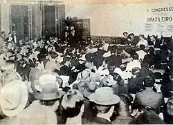 In August 1912, some unions started a new wave of strikes that lasted until the economic recession of 1914. In their first months, the workers obtained a series of victories, as was the case of a salary increase granted to shoemakers in Rio de Janeiro. On several occasions, the strikers agreed to return to work under the employers' promise to partially comply with their demands.[41] The most important of these strikes occurred in Minas Gerais, in Juiz de Fora, where, in August, several circumstances paralyzed their activities and the movement assumed the dimension of a general strike.[47] In addition to the strikes to reduce working hours, between 1912 and 1913 there were several demonstrations against expulsions of foreigners and campaigns against the loss of life.[48] The new rise of the workers' movement brought reactions from the authorities, with intensified repression and an attempt to expand and tighten the terms of the Adolfo Gordo Law.[46] On the other hand, Hermes da Fonseca's collaboration with the reformists made it possible, in November 1912, for the so-called Fourth Brazilian Workers' Congress,[B] at the seat of the Federal Senate and with the support of federal deputy Mário Hermes.[49]