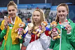 Day one of the 2018 Summer Youth Olympics in Buenos Aires, Argentina, at the Natatorium, Makarova swam the anchor leg of the 4×100 metre mixed freestyle relay in a time of 57.67, helping the relay qualify for the final ranked eighth, and won a gold medal in the event for her contribution in the prelims heats when the finals relay team, which did not include Makarova, finished first with a time of 3:28.50.[9][10] The same day, Makarova placed 14th in the semifinals of the 50 metre breaststroke and did not advance to the final of the event.[10] The next day, she split a 1:08.63 on the breaststroke leg of the 4×100 metre medley relay in the final to win the silver medal in a relay time of 4:06.07 with Daria Vaskina (backstroke), Polina Egorova (butterfly), and Elizaveta Klevanovich (freestyle).[11][12] In the final of the 100 metre breaststroke on day four, both Makarova and Niamh Coyne improved their final placement relative to the 2018 European Junior Championships, with Makarova winning the gold medal with a time of 1:07.88 and Niamh Coyne winning the silver medal in 1:08.90.[13][14]