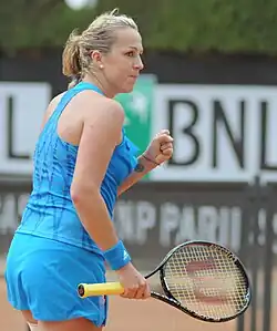 Pavlyuchenkova began the clay-court season at the Porsche Tennis Grand Prix where she lost to second seed Vera Zvonareva in the round of 16. She then defeated Zheng Jie, Marion Bartoli and Samantha Stosur to reach the quarterfinals of the Madrid Open where she lost to Julia Görges.[24] The following week in Rome, Pavlyuchenkova advanced to the round of 16 where she lost to third seed Victoria Azarenka, in three sets. Pavlyuchenkova was the 14th seed at the French Open and advanced to her first ever Grand Slam quarterfinal after racking in wins over Yaroslava Shvedova, qualifiers Mona Barthel and Nuria Llagostera Vives and third seed Zvonareva.[25] There, she came up short to defending champion Francesca Schiavone in three sets despite having been two games away from upsetting the Italian.[26][27]
