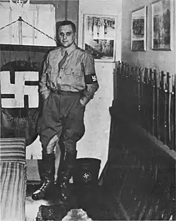 Vonsiatsky became a subject of FBI investigation and was indicted in 1942 for connections with proxies for German interests, including key participants in the pro-Nazi German American Bund, whose leader, Fritz Kuhn, had previously been assisted by Vonsiatsky's bail money in 1939.[3] Among other contacts was the American Hitler admirer William Dudley Pelley.[3] Federal authorities raided the VFO's compound, seizing 57 old Russian rifles, two tear gas guns and 18 cartridges, two automatic handguns, and large quantities of ammunition.[9] Indicted for conspiring to assist Nazi Germany in violation of the Espionage Act alongside fellow conspirators Wilhelm Kunze, Otto Willumeit, Wolfgang Ebell, and Reverend Kurt E. B. Molzahn, Vonsiatsky submitted a guilty plea after first protestations of innocence, and was convicted under the 1917 Espionage Act by a jury in Hartford, Connecticut on June 22, 1942. The lead prosecutor in the case was Thomas J. Dodd, a future U.S. Senator who went on to prosecute Nazi war criminals at the Nuremberg trials following the end of the war.[1]