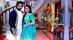 Anbe Vaa (transl. Come My Dear) is a 2020 Indian Tamil language soap opera on Sun TV. It was premiered on 2 November 2020 from Monday to Sunday and ended on 28 April 2024 and has been successfully running for 4 years and was replaced by Malli serial. The show stars Delna Davis,[2] Viraat and Shreegopika Neelanath [3] It is also available on the digital platform Sun NXT. This series was launched along with Kannana Kanne.