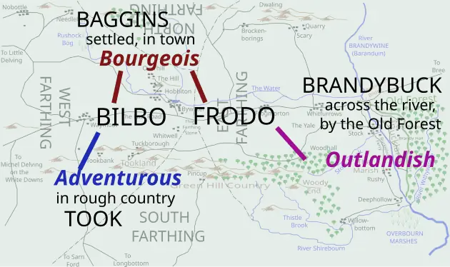 | A Small Part[a] of the Genealogy of the Baggins Family of Hobbits, from Appendix C of The Lord of the Rings,[T 2] annotated to show the inheritance of character[4] | ||||||||||||||||||||||||||||||||||||||||||||||||||||||||||||||||||||||||||||||||||||||||||||||||||||||||||||||||||||||||||||||||||||||||||||||||||||||||||||||||||||||||||||||||||||||||||||||||||||||||||||||||||||||||||||||||||||||||||||||||||||||||||||||||||||||||||||||||||||||||||||||||||||||||||||||||||||||||||||||||||||||||||||||||||||||||||||||||||||||||||||||||||||||||||||||||||||||||||||||||||||||
