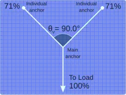 - At 120 degrees, each anchor bears a force equivalent to 100% of the original load. An angle this large should be avoided for safe climbing.