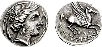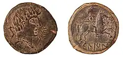 After this war, and the subsequent Roman annexation of much of the Peninsula, many indigenous towns and a few Roman colonial towns minted civic coins over the second and early first centuries. The main catalogue for these coins is the Corpus nummum hispaniae ante Augusti aetatem (CNH) but see also the more recent Diccionario de cecas y pueblos hispánicos.[28][29] The indigenous towns in Hispania Citerior minted coins with Iberian scripts and either Iberian or Celtiberian legends. These coins were often typologically similar, with a heroic male portrait on the obverse and a horseman on the reverse - the so-called "jinete" (horseman) coins. The areas in which coins were minted and circulating expanded as Roman control was spread into the interior of the Peninsula. The legends and iconography on coins from Hispania Ulterior were more diverse, with Latin legends common but also some Iberian scripts while Punic continued to be used in the old Phoenician colonies along the south coast. Hence although coins from this era are often called Iberian coins, this description does not cover all coins minted during the Republic. Indeed, a smaller number of Roman colonial towns minted in Latin, following Italian and Roman examples more closely. These include Valentia and Toletum. The numbers of towns minting peaked in the last third of the second century and early first century, and then declined rapidly in the early first century, particularly in Hispania Citerior after the end of the Sertorian War.[1]