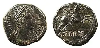 Ancient Iberian coinage began in the fifth century BC, and widespread minting and circulation in the Iberian peninsula began late in the third century, during the Second Punic War.[1] Civic coinages - emissions made by individual cities at their own volition - continued under the first two and a half centuries of Roman control until ending in the mid-first century AD.[2] Some non-civic coins were minted on behalf of Roman emperors during this period and continued to be minted after the cessation of the civic coinages.[3] After the cessation of the civic coinages, these Imperial coins were the only coins minted in Iberia until the coins of the Suebi and Visigoths.