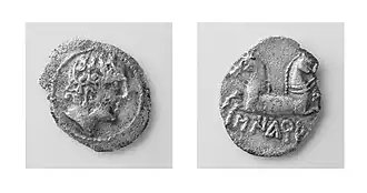 Along the east coast and particularly in the northeast a great number of towns minted silver drachmas. Some of these coins imitate the drachmas of Emporion or Massalia, while others have Iberian legends, a few of which can be related to towns or peoples but many of which are unknown or illegible.[25] This silver coinage is generally seen as minted by the pro-Roman side, particularly as little Roman coin seems to have reached the Peninsula given the concurrent fighting in the Italian Peninsula.[26] But given the fluid situation of the war, particularly in the early years, some of these emissions may have been minted to aid the Carthaginian cause.[27]