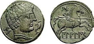 To fund their war effort, the Carthaginians minted gold, electrum, silver and bronze coins.[23] These coins may have been minted in the Barcid 'capital' of Carthago Nova or perhaps were minted simply in Carthaginian military camps. In addition to these coins and those of Gadir and Ebusus, Phoenician colonies along the south coast such as Malaka and Sexi also minted bronze coins.[24]