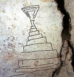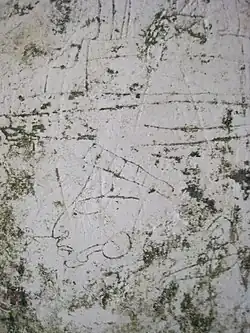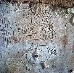 Ancient Maya graffiti are a little-studied area of folk art of the pre-Columbian Maya civilization.[1] Graffiti were incised into the stucco of interior walls, floors, and benches, in a wide variety of buildings, including pyramid-temples, residences, and storerooms. Graffiti have been recorded at over 50 Maya sites, particularly clustered in the Petén Basin and southern Campeche, and the Chenes region of northwestern Yucatán. At Tikal, where a great quantity of graffiti have been recorded, the subject matter includes drawings of temples, people, deities, animals, banners, litters, and thrones. Graffiti were often inscribed haphazardly, with drawings overlapping each other, and display a mix of crude, untrained art, and examples by artists who were familiar with Classic-period (c. 250–950 AD) artistic conventions.[2]