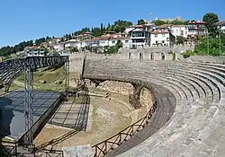 The Ancient theatre of Ohrid is located in Ohrid, North Macedonia.[1] It was built in 200 BC and is the only Hellenistic-type theatre in the country as the other three in Scupi, Stobi and Heraklea Lynkestis are from Roman times. It is unclear how many people the original theater used to seat, as only the lower section still exists. The open theater has a perfect location: the two hills that surround it keep it protected from winds that could interfere with acoustics during performances. It was built at the end of 3rd or the beginning of 2nd century BC, during the late Hellenistic period.[2]