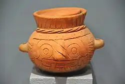 Although very rarely a complete vase, archaeology has resulted in pottery from the Dilmunite city of Qal'at al Bahrain being unearthed. There were two styles of pottery, "Barbar" and "Eastern." Sanctuaries would be filled with small figurines. Most of these figurines were of a bearded horseman holding a mount without reigns. Other figurines depicted hybrids between animals and people.[54] Inside ancient Dilmunite houses storage jars, painted pots, fine chisels, and copper have been found.[55]
