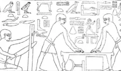 Before making or gathering the wood, a cubit rod was used to take measurements of the wood. Another tool used to take measurements. This tool was triangular, and was it made by using gravity to align a plumb bob to a centered marking on the device's frame. This plumb bob was weighed down by a line. To use this tool properly, the wood needed to be affixed to support frames. Only slight adjustments needed to be made to the wood. These slight adjustments were done to give the carpenter a level cutting surface. If a carpenter needed guidance on where and how to cut or measure the wood, try squares and cutting aids would be used.[51]