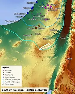 Soon after, also the Idumeans living in ancient Edom east of the Jordan river were displaced by invading Arabian Qedarites and moved to join their kin in southern Judah. Subsequently, sometime between the late 4th and early 2nd century BC, these Qedarites were themselves pushed northwestward by the invading Nabateans.[121][122] As a result, the Idumeans and Qedarites intermingled in southern Judah,[123] while the Nabateans settled in the former territories of Edom east of the river Jordan, the Negev, and Sinai,[124][125][126][127] taking control of these areas and the ancient trade routes.[128] They established the so-called "desert towns" located along the Negev incense route at Avdat, Mampsis, Rehovot, Shivta, Nessana, and especially Elusa, which was to become the new capital and the only polis of the Negev.[129]