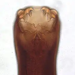 The teeth of A. caninum are found in the buccal capsule and divided into three sets.[1][2] Two ventral sets form a lower-jaw equivalent, while a further set projects from the dorsal side and loosely equates to an upper jaw.[2] Each ventral set has three points, with those furthest to the sides being the largest.[1][8] While the ventral sets are prominent, the dorsal set is hidden deeper in the buccal capsule.[1]