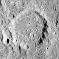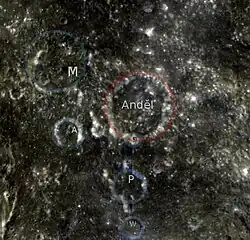 Anděl is a lunar impact crater that lies in the rugged central highlands of the Moon. It was named after the Czech astronomer Karel Anděl.[1] Nearby craters of note include Abulfeda to the south-southeast and Descartes to the east-southeast. About 85 kilometres to the east-northeast of the outer rim is the landing site of the Apollo 16 mission.