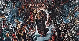 And the Saved World Remembers is a monumental painting by Belarusian artist Mai Dantsig measuring 3.75 m × 7 m (148 in × 276 in) and based on the Sistine Madonna by Raphael Sanzio.[1] Dantsig was inspired by the salvage of the Sistine Madonna from the bombing of Dresden during World War II.[1] And the Saved World Remembers depicts the moment when the Sistine Madonna was retrieved by the Soviets.[1] The background shows an army, the left side depicts a postman delivering news of victory amid ruined cities and the right side shows German soldiers among concentration camps. The painting also shows women lamenting their dead and a mine detector. Dantsig spent over ten years working on the painting and completed it in 1985, during the 40th anniversary of the end of World War II in Europe.[1]