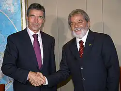 Anders Fogh Rasmussen S.K. (Danish: [ˈɑnɐs ˈfɔwˀ ˈʁɑsmusn̩] ⓘ; born 26 January 1953) is a Danish politician who was the prime minister of Denmark from November 2001 to April 2009 and the secretary general of NATO from August 2009 to October 2014.[1][2] He became founder of political consultancy Rasmussen Global[3] and founded the Alliance of Democracies Foundation. He serves as a senior adviser to Citigroup.[4] He also served as a senior advisor at the Boston Consulting Group.[5]