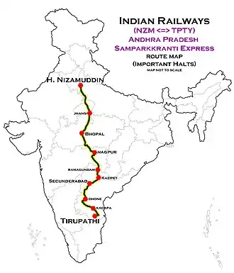 The 12707 / 12708 Andhra Pradesh Sampark Kranti Express is a South Central Railway train running from New Delhi to Tirupati. It is part of the Sampark Kranti Express series of trains, which link the Indian national capital, New Delhi, with the rest of the state capitals, with only a limited number of stops on each service.