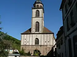 [32][33] Its Romanesque porch is a masterpiece of medieval Alsatian sculptural art. The crypt dates from the 11th century, the Virgin from the 15th and 16th centuries. The enormous 1715 pulpit. The tomb of Saint Richardis. Stalls from the 15th century. The present church was rebuilt in the 17th century. The massive sculpted frieze on the west wall is 30 m long and 0.60 m high and depicts animal motifs, characters (heroes of chivalry, history of Richardis, etc.). At the entrance are Christ and the Saints Peter and Paul with the first scenes of Genesis. The Abbey contains a very large number of items that are registered as historical objects.[32] - The Parish Church of Saint Fabien (14th century).