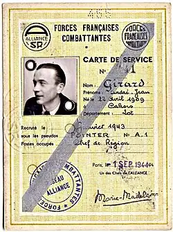 André Girard (born 22 April 1909 in Cahors, died 4 June 1993 in La Mulatière, near Lyon) was a French civil servant and Resistance worker with the ALLIANCE network.