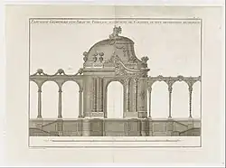 Roubo also had an interest in theatrical design, and published a treatise on the construction of theatres and theatrical mechanics in 1777, titled Traité de la construction des théâtres et des machines théâtrales.[9] This was reprinted by Slatkine Reprints in 1984 under the false name of Jacques-André (ISBN 2051006466). However, Roubo only published the first part (the history and architecture of theaters), even though the second part (on theatrical machines) was declared ready to print in 1777. The original work contains 66 pages of text and 10 engravings.
