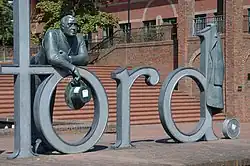 A bronze statue of Thomas Telford, in Telford Square in Telford, Shropshire, was unveiled in 1988 by William Francis, president of the Institution of Civil Engineers. The installation, including the name "Telford" in large letters, was made in collaboration with Glynwed Foundries Ltd. The statue leans of the "o" of his name and his coat hangs on the "d".[4]