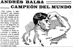 By 1912, news about his achievements across the United States was already being covered in some American newspapers, including in Texas, which recounted his exploits in outdoor combat; the Americans soon began to call him "Bull-Dog" because he was unstoppable in a fight.[6] In 1915, Balsa was one of the 35 wrestlers who participated in the world wrestling tournament held in New York, where he achieved three victories before falling to the eventual champion.[7]
