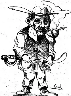 ![]() Caricature of Andrés Baquero. In his hands he holds a sabre with the name "Antonete", due to a controversy of the time about the authenticity of the weapon that was then exposed in the Provincial Museum as belonging to the revolutionary Antonio Gálvez Arce. | |