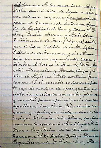 Three years prior to his death, on 22 August 1906, Bishop Ferrero presided at the solemn Pontifical Mass for the funeral of his batch mate and future saint, Ezequiél Moreno y Díaz, Bishop of Pasto, Colombia.[9]