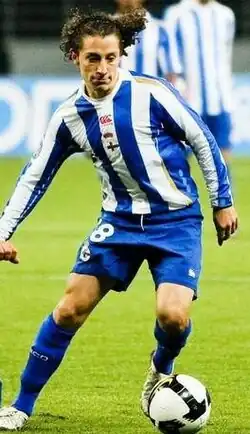 Guardado was officially introduced on 24 July 2007, with the Spanish team giving him the number 18 shirt.[18] He made his La Liga debut on 26 August in a 3–0 home loss to UD Almería[19] and on 16 September scored his first goal against Real Betis, attacking a long throw-in at the back post, in which his attempt was described as "karate style" finish, in a 1–0 victory.[20][21] He finished his first season with 26 games and five goals as Depor finished in ninth position, eventually qualifying to the UEFA Intertoto Cup – and the subsequent UEFA Cup, where he scored in a 3–0 group stage home win over Feyenoord;[22] he was voted by fans as the best player.[23]