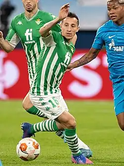In December 2019, the 33-year-old Guardado renewed his contract until 2022.[76] On 4 July 2020 he made his 100th official appearance for the Andalusians, captaining the side in their 1–1 league draw to RC Celta de Vigo[77] and becoming the first Mexican to reach that mark for three European clubs in the process.[78] On 11 July, he picked up a hamstring injury in a 1–0 league loss to Atlético Madrid, causing him to miss the rest of the season.[79]