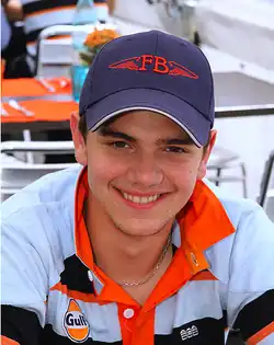 ![]() Andrea Barlesi at Spa putting on a Fernando Bachmann face cap and Gulf Racing polo shirt in 2011. | |