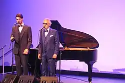 Bocelli also spent time singing during his childhood.[24] He gave his first concert in a small village not far from where he was born.[21] He won his first song competition at age 14 with "'O sole mio" at the Margherita d'Oro in Viareggio.[24] He finished secondary school in 1980, and then studied law at the University of Pisa.[25][18] To earn money, he performed evenings in piano bars, and it was there that he met his future wife Enrica in 1987.[18] He completed law school and spent one year as a court-appointed lawyer.[26]
