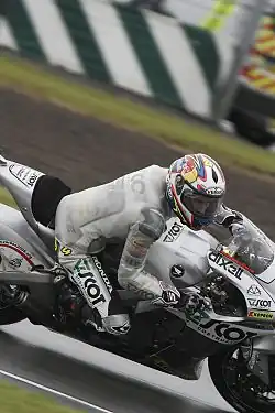 For the 2009 season, Dovizioso became an official Repsol Honda rider replacing Nicky Hayden and partnering Spain's Dani Pedrosa.[11] In July 2009, Dovizioso won his first race in MotoGP at the British Grand Prix in wet conditions at Donington Park.[12] Despite otherwise consistent points finishes, Dovizioso ended up with fewer points than in his début season in the class, finishing sixth in the final standings.