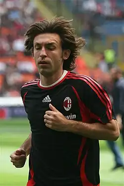 It was at Milan, in particular under manager Carlo Ancelotti, where Pirlo made big strides in developing into a world class player, and one of the best deep-lying playmakers and set-piece specialists in the world, as he went on to achieve notable domestic and international success during his time with the club. Pirlo later recalled the period he has spent in Milan with Ancelotti: "He changed my career, putting me in front of the defence. We shared some unforgettable moments. We had a magnificent past together."[40] After Mazzone's pioneering decision to move Pirlo into a deep-seated playmaking role with Brescia during the previous season,[41] Milan managers Fatih Terim and, in particular, Carlo Ancelotti further developed this role for him at Milan.[30] In Ancelotti's 4–3–1–2 and 4–3–2–1 formations, Pirlo was deployed as a deep-lying playmaker in front of the defence,[42] which allowed him to play alongside other talented attacking midfielders, such as Rivaldo, Rui Costa and eventually Kaká, replacing the gap left by Milan legend Demetrio Albertini in the deep midfield playmaking role. He would become an integral part of the Rossoneri's midfield, forming a formidable partnership with Gennaro Gattuso, as well as with Clarence Seedorf and Massimo Ambrosini, who also supported his playmaking role defensively. Pirlo was given the nickname the metronome during his time at the club, for the way in which he set the team's rhythm.[7][43][44][45]