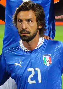 Pirlo played in the 2012 Supercoppa Italiana in Beijing on 11 August 2012 against Napoli, helping Juventus to a 4–2 win in extra time.[106] He curled in a free kick to seal a 2–0 defeat of Parma on the opening day of the new Serie A season. The goal caused much controversy, as the Parma players protested that it had not gone over the line, and replays proved inconclusive.[107] In the following league match against Udinese on 2 September, Pirlo helped to win a penalty and assisted Sebastian Giovinco's second goal of the match, as Juventus went on to defeat the home team 4–1.[108] On 29 September, Pirlo opened the scoring when he dispatched a trade mark free kick to send Juventus on their way to a 4–1 defeat of Roma.[109] Pirlo was nominated for the 2012 FIFA Ballon d'Or, along with Juventus and Italy teammate Gianluigi Buffon, following their performances throughout the calendar year.[110] Pirlo provided three assists for Juventus during the group stage, helping them to top their group undefeated and advance to the knockout stages for first time since the 2008–09 tournament.[111] Pirlo was also elected the 2012 Serie A Footballer of the Year, as well as the best midfielder of the season, also winning the 2012 Guerin d'Oro. He was named as part of the 2012 Serie A team of the Year for his performances.[14] Pirlo also won the Pallone Azzurro, given to the best player of the year in the Italy national team,[112] as well as placing fourth in the IFFHS World's Best Playmaker of the Year Award,[113] and seventh in the FIFA Ballon d'Or.[114] Pirlo and Juventus retained their Serie A title that season. Juventus were, however, eliminated by Bayern Munich in the quarter finals of the UEFA Champions League, and in the semi-finals of the Coppa Italia by Lazio; both of these teams were the winners of these respective competitions.[115][116]