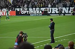On 26 March 2012, Inter manager Claudio Ranieri was sacked and Stramaccioni was promoted to manager of the first team as caretaker,[10] with Giuseppe Baresi returning to act as assistant coach.[11] He led Inter to sixth place and a success in the Derby della Madonnina against Milan that cost Inter's crosstown rivals the Serie A title; his results led club owner Massimo Moratti to confirm him as head coach for the 2012–13 season, as well.[12] The FIGC allowed Stramaccioni to sign the contract without a UEFA Pro Licence as he was admitted to 2012–13 coaching course in order to obtain the licence in June 2013. On 7 October 2012, Stramaccioni guided Inter to a 1–0 victory over Milan, emotionally crying "è vostro, è vostro, questo derby è vostro" (Italian for "it's yours, it's yours, this derby is yours") towards Inter supporters at the end of the game. On 3 November 2012, Stramaccioni guided Inter to a 3–1 away victory over the previous season's champions, Juventus, claiming "[The] result will send a signal, as we came here to the Juventus Stadium against a team unbeaten in 49 rounds and attacked them with a trident". After 14 months in charge of Inter and a difficult 2012–13 Serie A campaign which saw them finish in 9th place and thus fail to qualify for Europe for the first time in 15 seasons, the club announced on 24 May 2013 that Stramaccioni had been sacked and replaced by Walter Mazzarri.[13][14]