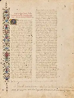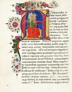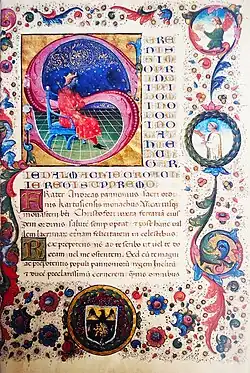 Its cover (1 recto) is highly decorated: all four sides are surrounded by flowers and leaves. On the right edge there are miniatures in two medallions. The top miniature depicts an angel wearing a green robe and holding a crown. The lower miniature depicts a Carthusian monk with gentle features, the author himself, Andreas Pannonius, holding a book bound in red leather (i.e. the work itself). The central initial "S" on the cover depicts Matthias Corvinus, the angel and the monk both extend the crown and the work towards him, respectively. The depiction of Matthias is very different from the images created by his contemporaries and those created in the king's environment: it is clear that the illustrator was not familiar with the king's appearance, so he used his imagination to depict a ruler similar to Italian princely figures (e.g. clothing).[49] Most of the art historians – e.g. Ilona Berkovits, Konrad Oberhuber and Dániel Pócs – identified the illustrator with Early renaissance manuscript illuminator Guglielmo Giraldi, who was active in Ferrara in those years.[50] Outside the cover, Andreas' work is decorated with only a few initials.[49] Another folio (60 verso) depicts a divina iustitia miniature in initial "A".[51]