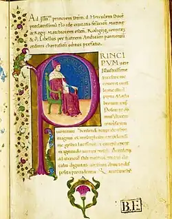 Its only known manuscript is located in the Biblioteca Estense (Lat. 108, α.Q.9.12) in Modena.[30] The red membrane codex consists of 116 folios (20x14 cm) each of them is filled with 24 lines of writing. The handwriting is in angular Gothic letters, which was typical of works compiled in monasteries in the second half of the 15th century. The title page is ornately displayed, a flower garland runs along its left side. Flowers are also painted on the lower edge. The capital initial of the dedication ("P") depicts a figure of a prince (undoubtedly Ercole) dressed in purple, with the following inscription: "Dominus fortitudo mea."[78] The illumination was painted by Guglielmo Giraldi, which indicates that Andreas was able to maintain his connections in Ferrara even after his "exile".[77] This manuscript is probably an autograph that the author offered to the prince, whose library the work was then included in.[78]