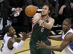 Bogut appeared in just 36 games for the Bucks in 2008–09, missing the final 31 games of the season with a stress fracture in his lower back.[16] He faced more time on the sidelines during the 2009–10 season due to a strained ligament and bruise in his left leg.[16] On 3 April 2010, near the end of a breakout season, Bogut suffered a major injury. That night, in a game against the Phoenix Suns at the Bradley Center, Bogut had a chance to score on a fast break attempt. As he went up, Amar'e Stoudemire appeared to make some contact with Bogut and he lost his balance while completing the dunk. He hung onto the rim for a brief moment to try to right himself but could not, and fell at an awkward angle. Placing his right arm out to break the fall, Bogut landed with all of his weight on top of his wrist and his arm twisted as he landed.[17] The next day, Bogut was diagnosed with a broken hand, dislocated elbow and sprained wrist, injuries that kept him out of for the remainder of the 2009–10 season.[18] In what was a breakout season for Bogut, he finished with averages of 15.9 points, 10.2 rebounds and 2.5 blocks per game, earning All-NBA Third Team honours, becoming first Bucks player named to the squad since Michael Redd in 2003–04.[19] Bogut helped the Bucks to a 46–36 record, their most wins since going 50–32 in 2000–01, and their first playoff appearance since 2006.[19]