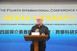 ![]() Burn addressing the International Media Literacy conference, Hong Kong, 2015 | |